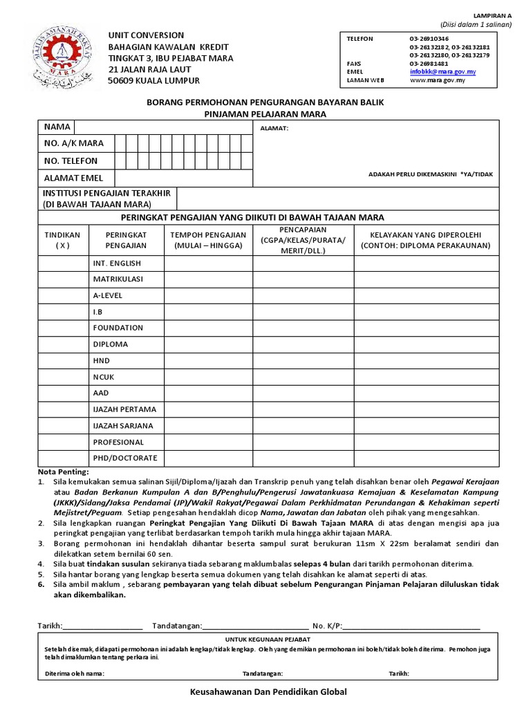 Cara permohonan pengurangan pinjaman pelajaran mara online. Permohonan pengurangan pinjaman pelajaran mara secara online. Pelajar perlu mengisi maklumat dan hantar maklumat anda secara online. Untuk download borang cik boleh taip borang pengurangan bayaran balik mara di enjin carian google. Permohonan pinjaman pelajaran mara tesp 2021 telah dibuka bermula 28 mei 2021 sehingga 11 jun 2021. Okay dah lama janji nak buat entri ni, tapi sekarang baru berkesempatan. Maka aku ke kaunter 2, disapa mesra oleh puan zaiton. Bagi yang nak minta pengurangan bayaran balik pinjaman mara, syarat dia korang boleh baca kat sini. Berikut adalah soalan lazim yang berkaitan dengan pengurangan bayaran balik pinjaman pelajaran mara. Jadi bayaran balik adalah rm 64,677.83. Jadi untuk buat permohonan cik perlu buat secara manual (isi borang dan hantar ke pejabat mara). Pemohon perlu layari econversion secara online melalui pautan seperti berikut: Anda boleh berbuat demikian dengan menggunakan borang permohonan pengurangan pinjaman pelajaran mara online yang mana pautan (link) ada disertakan di sini.